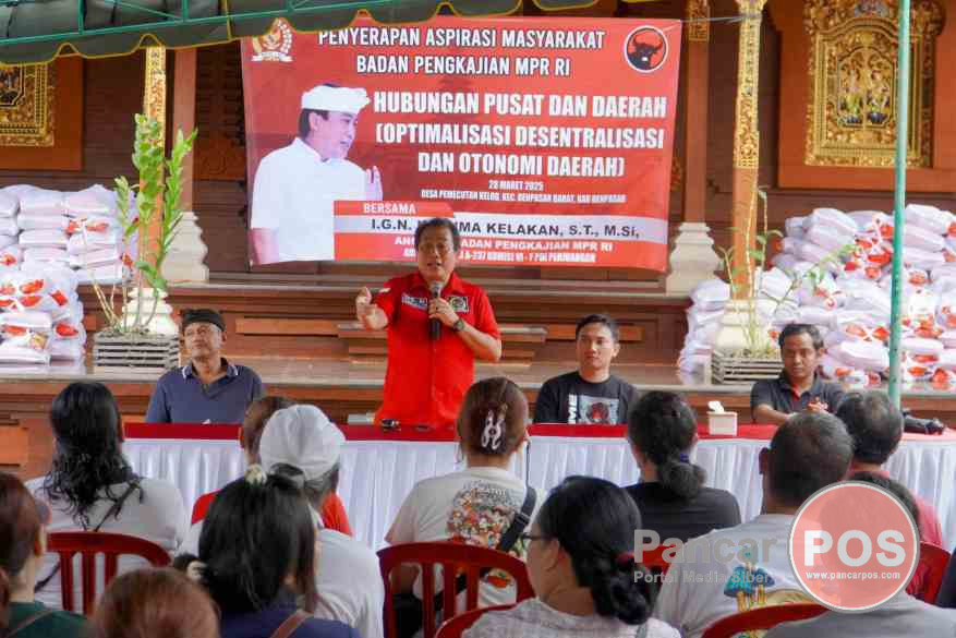 Denpasar, PancarPOS | Badan Pengkajian MPR RI kembali turun ke bawah atau Turba untuk menggelar kegiatan penyerapan aspirasi masyarakat di Desa Pemecutan Kelod, Kecamatan Denpasar Barat, Kabupaten Denpasar, pada Jumat 28 Maret 2025. Dialog kerakyatan ini, menghadirkan I.G.N. Kesuma Kelakan, S.T., M.Si, selaku anggota Badan Pengkajian MPR RI, sekaligus anggota Komisi X DPR RI dari Fraksi PDI Perjuangan. Tema utama yang diangkat adalah “Hubungan Pusat dan Daerah: Optimalisasi Desentralisasi dan Otonomi Daerah.”