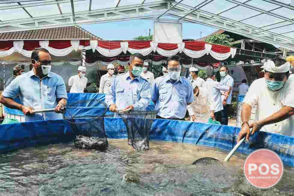 Jembrana-Tabanan, PancarPOS | Ketahanan pangan selama pandemi Covid-19 menjadi perhatian sangat serius bagi Anggota Komisi IV DPR RI dari Fraksi PDI Perjuangan, Drs. I Made Urip, M.Si. Untuk itu, anggota parlemen di Senayan yang akrab dikenal sebagai Wakil Rakyat Sejuta Traktor itu, bersama Dirjen Perikanan Budidaya KKP Dr. Slamet Soebjakto diwakili Direktur Produksi dan Usaha KKP Arik Hary Wibowo didampingi Bupati Jembrana I Putu Artha, dan Anggota Fraksi PDIP DPRD Jembrana I Ketut Suastika melakukan Panen Perdana Budidaya Ikan Lele Sistem Bioflok di Pokdakan Mina Kembang Jembrana, Lingkungan Pendem, Kelurahan Pendem, Kecamatan Jembrana, Jembrana, Kamis (1/10/2020).