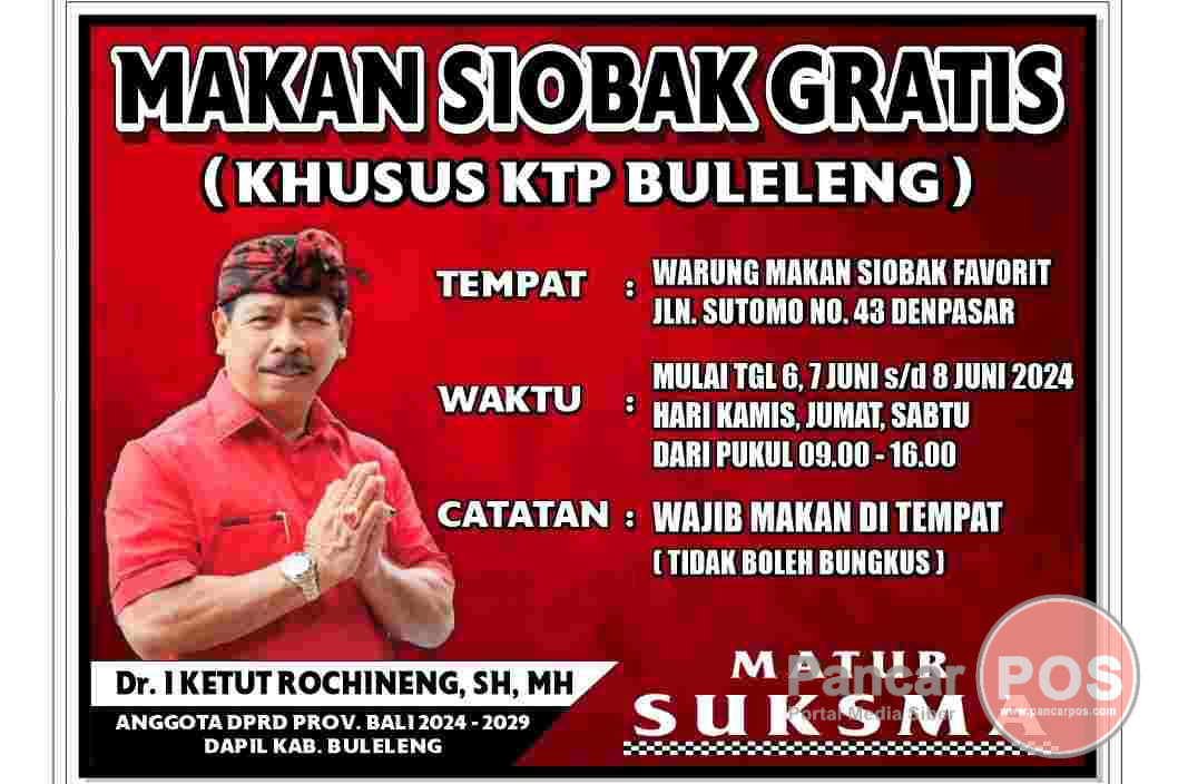 Denpasar, PancarPOS | Ide unik dan menarik muncul dari Dr I Ketut Rochineng SH MH yang terpilih kembali sebagai Anggota DPRD Provinsi Bali periode 2024-2029. Ya, pria yang akrab disapa Rocky. N ini bakal menggelar Program Makan Siobak Gratis khusus bagi warga yang ber-KTP Buleleng.