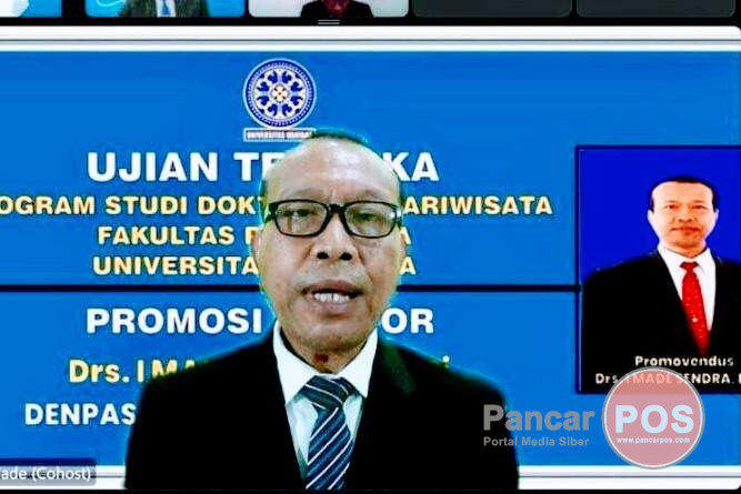 Denpasar, PancarPOS | Sidang Terbuka Promosi Doktor Fakultas Pariwisata Universitas Udayana yang digelar secara daring, Jumat (18/3/2022) menandai kelahiran seorang doktor pariwisata baru di Unud. Sidang dengan promovendus I Made Sendra, M.Si., merupakan sidang terbuka promosi doktor ke-79 di Fakultas Pariwisata Unud. Sidang dipimpin oleh Dr. I Wayan Suardana, SST.Par., M.Par. bersama penguji Prof. Dr. I Wayan Ardika, M.A. (Promotor); Prof. Dr. Ida Bagus Wiyasa Putra, SH., M.Hum. (Kopromotor 1); Prof. Dr. I Nyoman Darma Putra, M.Litt. (Kopromotor 2); Prof. Dr. I Nyoman Sedana, M.A., Dr. Drs. I Nyoman Sunarta, M. Si, Dr. Drs. I Putu Anom, M.Par., Dr. Drs. Ida Bagus Pujaastawa, M.A., dan Dr. Yohanes Kristianto, S.Pd., M.Hum.