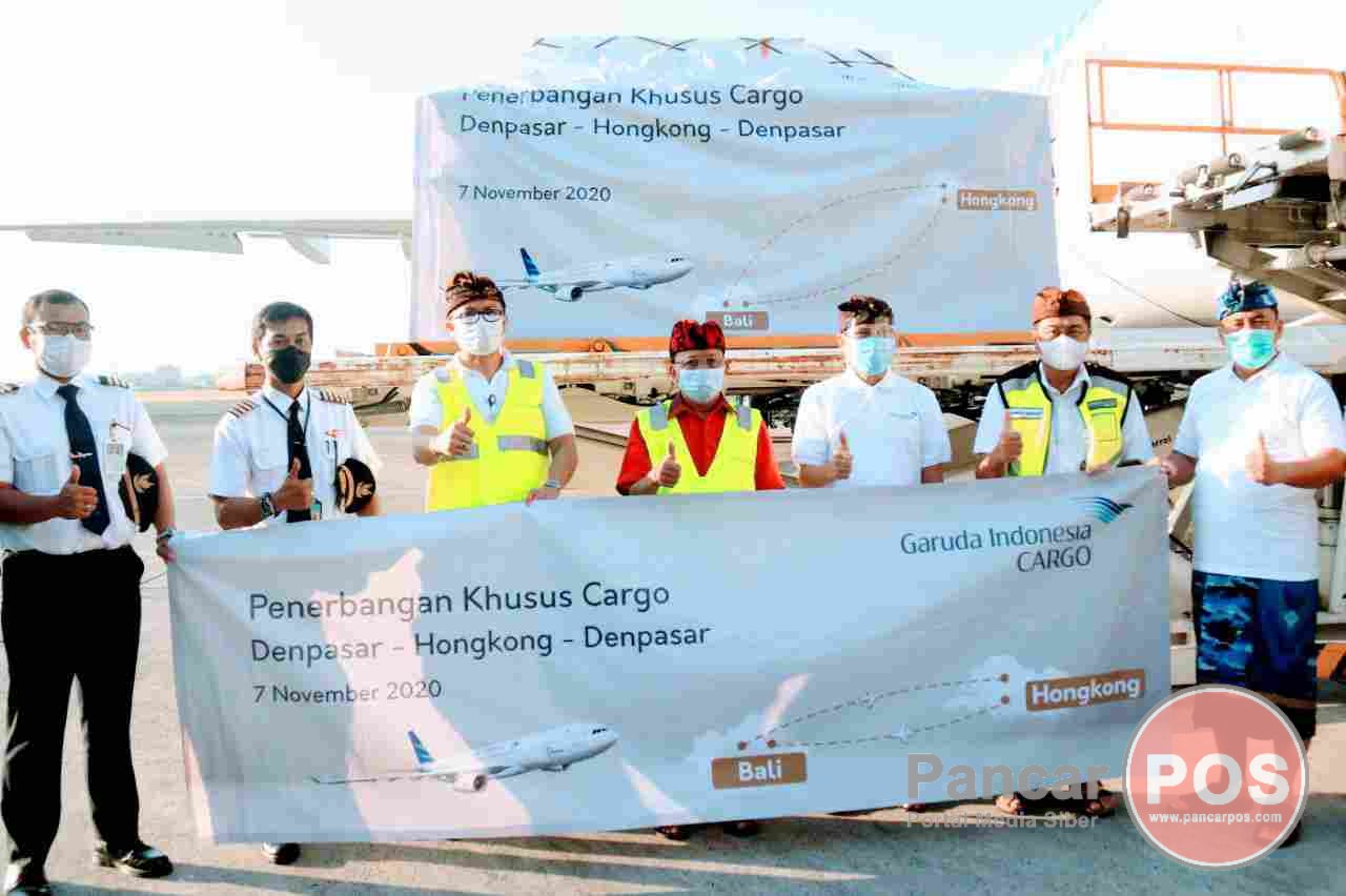 Denpasar, PancarPOS | Gubernur Bali Wayan Koster secara resmi melepas penerbangan perdana Maskapai Garuda Indonesia rute khusus kargo Denpasar – Hongkong di Bandara Internasional I Gusti Ngurah Rai, Denpasar, Sabtu (7/11/2020) pagi. Penerbangan perdana ini mengangkut sebanyak 30 ton kargo yang terdiri dari komoditas perikanan dan hasil bumi lainnya dari Bali. Gubernur Bali Wayan Koster mengapresiasi dan menyambut baik ekspor komoditas lokal Bali di tengah kondisi industri pariwisata yang belum kembali normal akibat pandemi Covid-19.