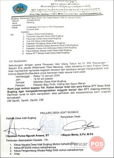 Karangasem, PancarPOS | Manuver politik Kelian Desa Adat Bugbug, I Nyoman Purwa Ngurah Arsana kembali mematik emosi dan respon negatif dari warga Desa Adat Bugbug. Ajang politik praktis yang dilakukan oleh Anggota DPRD Bali dari PDI Perjuangan itu, membuat gerah masyarakat adat setempat. Pasalnya, kasus di Desa Bugbug yang masih belum mereda kembali ditaburi safari politik yang mengundang reaksi keras krama Desa Adat Bugbug. Melalui surat yang ditandatangani langsung Kelian Desa Adat Bugbug, I Nyoman Purwa Ngurah Arsana bersama Sekretaris atau Penyarikan Gede, I Wayan Merta, S.Pd., M.Pd., itu meminta seluruh Kelian Banjar Adat, dan para Ketua STT Desa Adat Bugbug agar mengerahkan anggota banjar dan STT masing-masing untuk menghadiri Perayaan Hari Ulang Tahun ke-51 PDI Perjuangan, pada Rabu, 10 Januari 2024 di Wantilan Desa Adat Bugbug. “Satyam Eva Jayate (kebenaran pasti menang), maka bersama ini kami Prajuru Desa Adat memberikan apresiasi kegiatan tersebut, dan sekaligus sangat mengharapkan sudi kiranya bapak/ibu/saudara untuk berkenan hadir,” tulis isi surat undangan tersebut.
