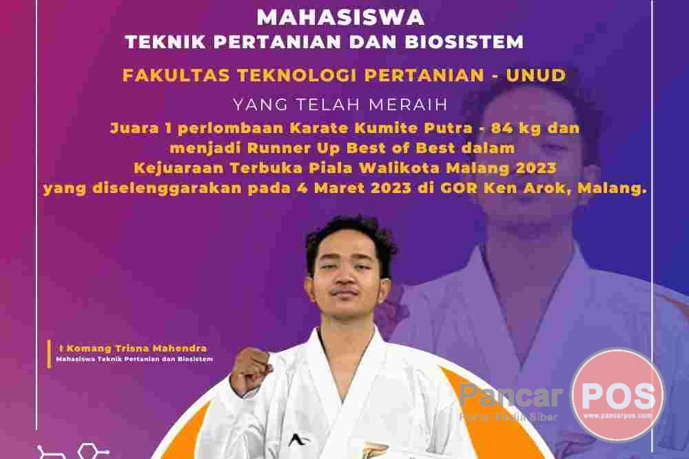 Badung, PancarPOSMahasiswa Program Studi Teknik Pertanian dan Biosistem Fakultas Teknologi Pertanian Universitas Udayana (TPB FTP Unud) atas nama I Komang Trisna Mahendra angkatan 2021 berhasil meraih prestasi juara 1 perlombaan Karate Kumite Putra- 84 kg dan menjadi Runner Up Best of Best dalam Kejuaraan Terbuka Piala Walikota Malang 2023 yang diselenggarakan pada 4 Maret 2023 di GOR Ken Arok, Malang.