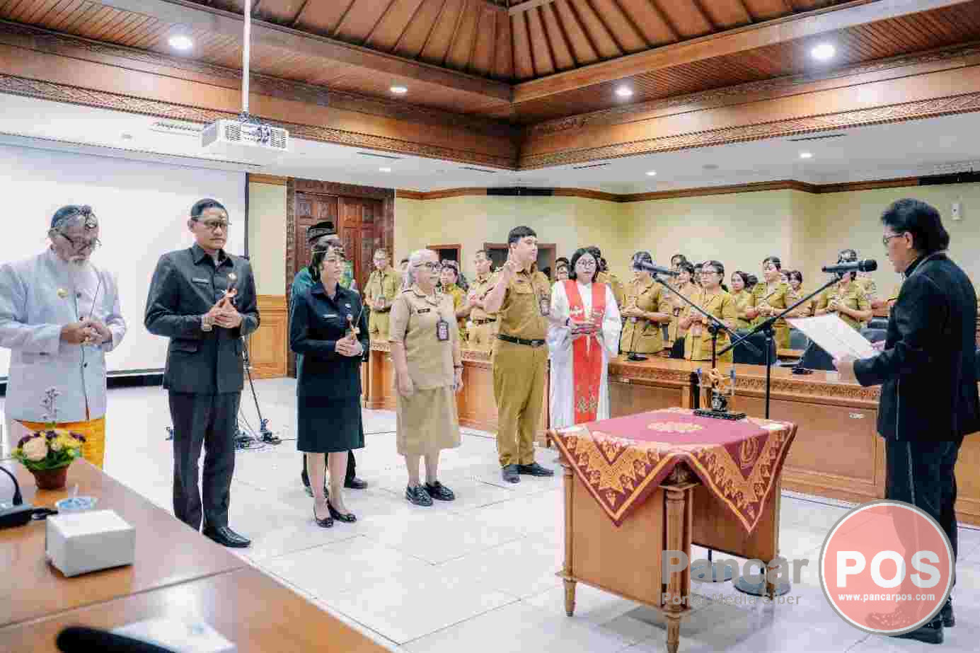 Badung, PancarPOS | Bupati Badung I Nyoman Giri Prasta melantik dan mengambil sumpah 41 Pejabat di Lingkungan Pemerintah Kabupaten (Pemkab) Badung yang terdiri dari 2 Pejabat Pimpinan Tinggi Pratama (Eselon II) dan sebanyak 39 Pejabat Fungsional, bertempat di Ruang Kriya Gosana, Puspem Badung, Senin (12/8/2024). Sebelum di lantik para pejabat melaksanakan prosesi mejaya-jaya di Pura Lingga Bhuana Puspem Badung yang puput oleh Ida Pedanda Gede Oka Watu Lumbang Manuaba dari Griya Magelung Baha, Mengwi.