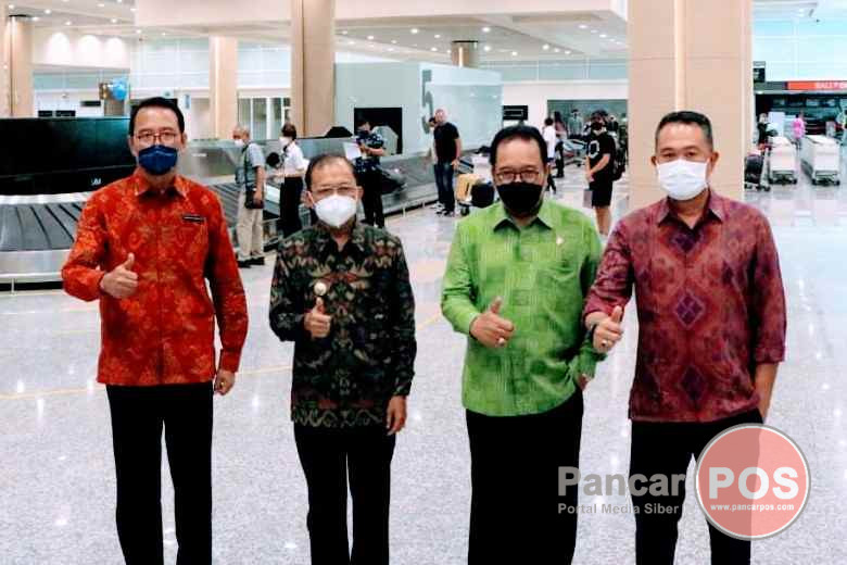 Badung, PancarPOS | Gubernur Bali, Wayan Koster bersama Wakil Gubernur Bali, Tjokorda Oka Artha Ardhana Sukawati meninjau langsung kedatangan maskapai Singapore Airlines untuk pertama kali sejak Pandemi Covid-19. Singapore Airlines terbang menuju Bandara Internasional I Gusti Ngurah Rai membawa wisatawan ke Bali, pada Rabu (Buda Pon Bala), 16 Pebruari 2022.