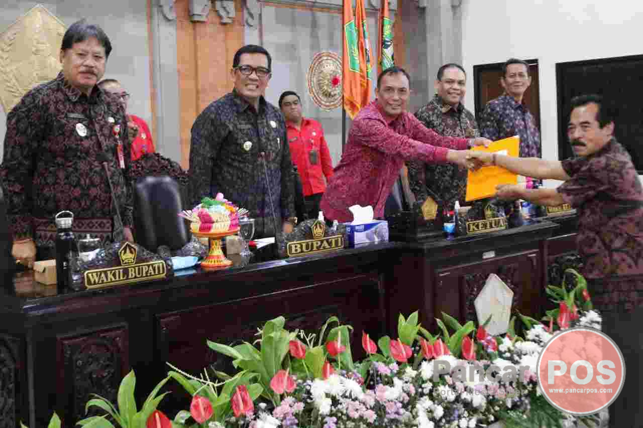 Ketua DPRD Tabanan I Made Dirga bersama jajaran legislatif menerima pidato pengantar dari Bupati Tabanan I Komang Gede Sanjaya yang membuka pembahasan terhadap empat Ranperda penting, yakni: