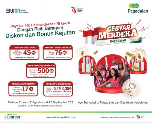 Jakarta, PancarPOS | Kabar gembira, dalam rangka merayakan dan memeriahkan Hari Ulang Tahun Kemerdekaan Republik Indonesia ke-76 PT Pegadaian (Persero) memberikan apresiasi kepada masyarakat Indonesia dengan menyelenggarakan Program Gebyar Merdeka Tahun 2021. Program ini dimulai pada tanggal 17 Agustus s.d. 17 September 2021. Masyarakat yang bertransaksi produk gadai di outlet Pegadaian seluruh Indonesia, akan mendapatkan promo menarik. Sekretaris Perusahaan PT Pegadaian (Persero) R. Swasono Amoeng Widodo menjelaskan, nasabah akan memperoleh promo pengembalian tunai (cashback) sebesar 17% hingga 45% setiap kali bertransaksi.