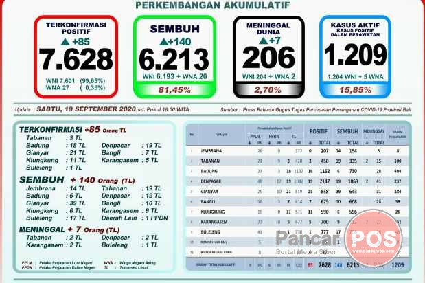 Denpasar, PancarPOS | Perkembangan Pandemi Covid-19 di Provinsi Bali per hari ini mencatat pertambahan kasus terkonfirmasi positif sebanyak 85 orang melalui transmisi lokal, namun angka kesembuhan meningkat tajam hingga sebanyak 140 orang, dan meninggal Dunia sebanyak 7 orang. Ketua Harian Gugus Tugas Penanganan Covid-19 di Bali, Dewa Made Indra menjelaskan jumlah kasus secara kumulatif sebagai berikut, terkonfirmasi positif 7.628 orang,