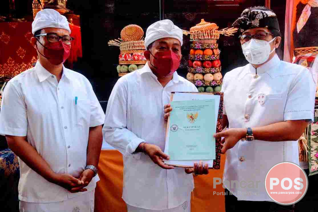 Badung, PancarPOS | Bupati Badung I Nyoman Giri Prasta bersama Ketua DPRD Badung Putu Parwata menghadiri Pujawali Pura Pengulun Banjar Legian Kaja, Desa Adat Legian, Kelurahan Legian, Kecamatan Kuta, Jumat (17/9/2021). Bupati menyerahkan hibah tanah Pemkab Badung dengan sertifikat Hak Guna Pakai (HGP) menjadi pelaba Pura Pengulun Banjar Legian Kaja. Hibah tanah seluas 410 meter persegi yang berlokasi di LC Legian ini rencananya akan dibangun Tempat Pengolahan Sampah, Reuse, Reduce, Recycle (TPS 3R). Acara tersebut dihadiri pula anggota DPRD Badung Gusti Anom Gumanti dan Gusti Ngurah Sudiarsa, Camat Kuta beserta Tripika Kecamatan, Lurah Legian, Bendesa Adat Legian dan tokoh masyarakat setempat.