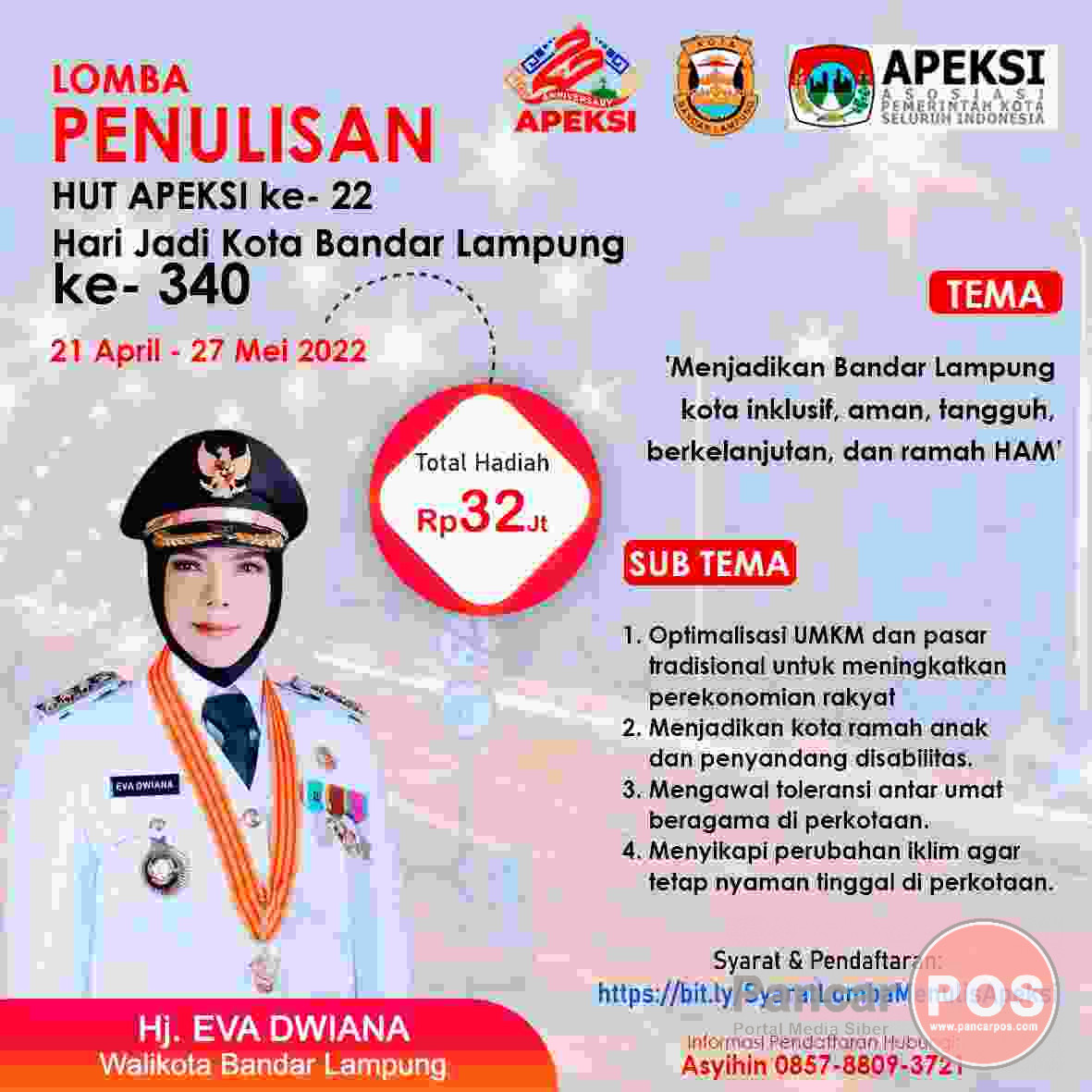 Bandar Lampung, PancarPOS | Pemerintah Kota Bandar Lampung menggelar lomba penulisan dalam menyambut Hari Ulang Tahun (HUT) ke-22 Asosiasi Pemerintah Kota (Apeksi) mulai 21 April – 8 Mei 2022. Lomba ini untuk memeriahkan pertemuan wali kota se-Indonesia yang berlangsung di Bandar Lampung pada 27-29 Mei 2022.