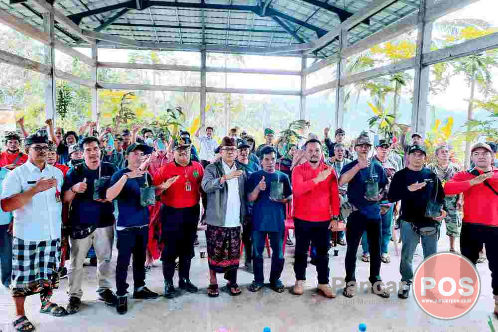 Tabanan, PancarPOS | Anggota Komisi IV DPR RI dari Fraksi PDI Perjuangan, Drs. I Made Urip, M.Si., kembali turun ke bawah atau Turba untuk menemui kelompok tani di pelosok desa. Kali ini, Ketua DPP PDI Perjuangan membidangi Pertanian, Kehutanan dan Lingkungan Hidup itu, juga membawa oleh-oleh bantuan aspirasi pertanian yang diserahkan secara simbolis, berupa 1.000 bibit pohon Durian Musang King untuk mendukung Kampung Buah Durian di Desa Mudeh Kangin, Kecamatan Selemadeg Barat, Tabanan, Kamis (21/7/2022). Kunjungan Made Urip yang biasa dikenal sebagai Wakil Rakyat Sejuta Traktor yang akrab disapa M-U itu, diawali dengan penamanan bersama bibit Durian Musang King, sekaligus menyerahkan bantuan lainnya, berupa 1.200 Kg pupuk organik padat, 1.000 Kg Dolomit dan 195 Kg Tricoderma yang diterima oleh Kelompok Tani Merta Harum di Desa Mundeh Kangin.