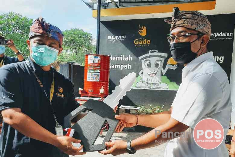 Denpasar, PancarPOS | Pegadaian Kanwil VII Denpasar menyerahkan bantuan Program The Gade Clean and Gold kepada Bank Sampah Catur Ubung Lestari, Kamis (23/7/2020). Bantuan tersebut diharapkan memaksimalkan pengelolaan sampah masyarakat yang telah berdiri sejak tahun 2014. “Program Pegadaian Bersih Lingkungan merupakan bagian dari program CSR Pegadaian The Gade Clean and Gold yakni memilah sampah menabung emas dengan membangun bank sampah,” jelas Kepala Departemen Gadai Area Denpasar I, I Ketut Suarnawa.