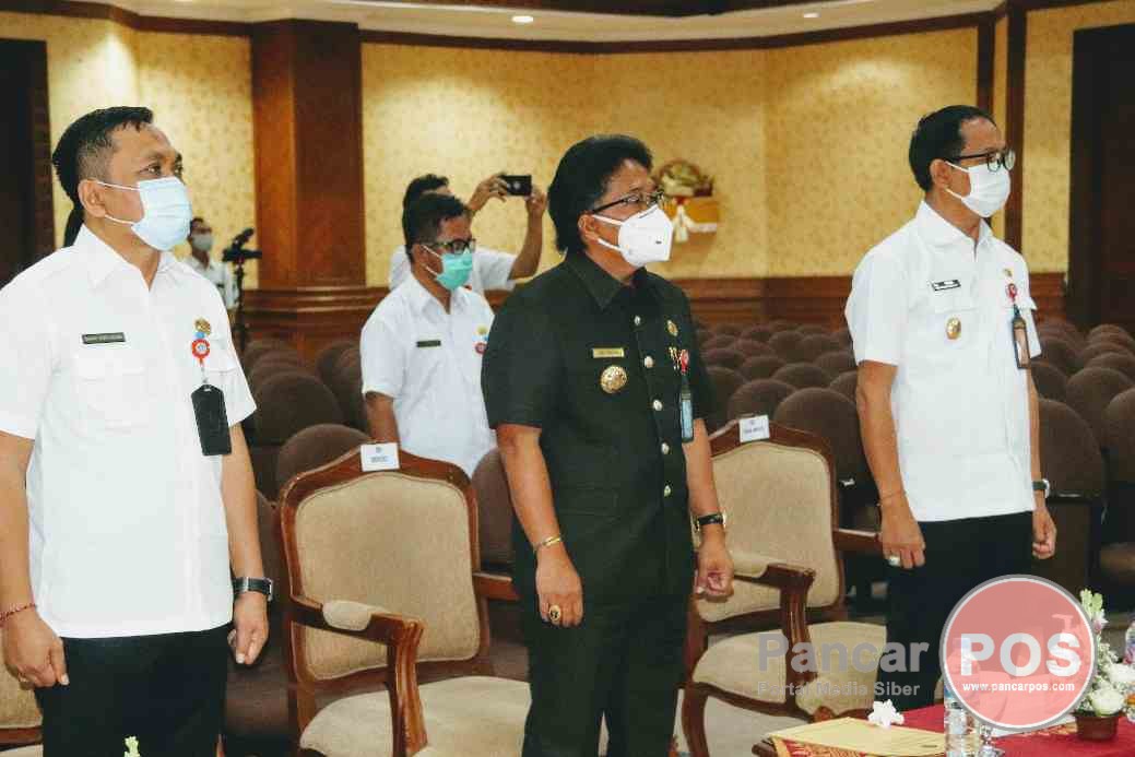 Badung, PancarPOS | Bupati Badung I Nyoman Giri Prasta bersama Wakil Bupati Badung I Ketut Suiasa menghadiri pengukuhan Forum Komunikasi Kepala Lingkungan dan Kelian Banjar Dinas (FK3D) Kabupaten Badung periode tahun 2020-2023, di Ruang Pertemuan Kertha Gosana Puspem Badung, Rabu (23/9). Pengukuhan dilakukan oleh Ketua Panitia I Kadek Arya Minarta dimana I Gusti Ngurah Suwindra ditetapkan selaku Ketua Umum FK3D Badung. Guna mentaati protokol kesehatan Covid-19, pengukuhan dilakukan secara simbolis yang diikuti 14 orang, sementara Perbekel/Lurah dan anggota FK3D yang lain mengikuti secara virtual dari kantor Desa/Lurah masing-masing. Pada kesempatan tersebut Bupati juga menyampaikan sosialisasi Peraturan Bupati (Perbup) Badung No. 52 tahun 2020 tentang Penerapan Disiplin dan Penegakan Hukum Protokol Kesehatan Covid-19 Sebagai Upaya Pencegahan dan Pengendalian Dalam Tatanan Kehidupan Era Baru.