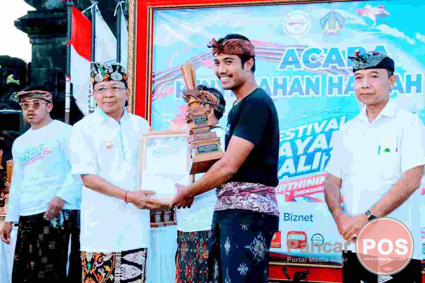 Denpasar, PancarPOS | Gubernur Bali, Wayan Koster menyerahkan Piala Gubernur Bali kepada I Ketut Widia dari Drangdang Team, Tanjung Benoa, Badung sebagai Pemenang Grand Champions Festival Layangan Bali Tahun 2022 di Monumen Perjuangan Rakyat Bali, Renon, Denpasar pada Kamis (25/8/2022).