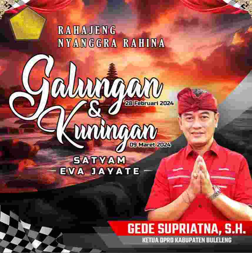 Oleh karena itu, Ketua DPRD Buleleng Gede Supriatna Selamat Hari Raya Galungan dan Kuningan, di Kantor DPRD Buleleng, pada Senin, 26 Maret 2024. “Rahajeng rahina Galungan Ian Kuningan. Dumogi sangkaning paswecan Ida Sang Hyang Widhi Wasa, iraga prasida nemoning kerahayuan,” ucapnya. mas/ama/*