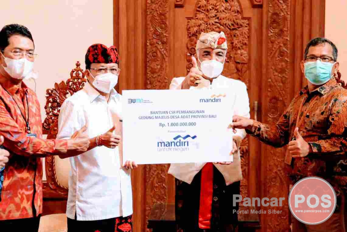 Denpasar, PancarPOS | Gubernur Bali Wayan Koster menerima secara simbolis bantuan Corporate Social Responsibility (CSR) sebesar Rp1 miliar dari PT Bank Mandiri (Persero) Tbk Regional XI Bali & Nusa Tenggara, untuk selanjutnya diserahkan kepada Bendesa Agung Majelis Desa Adat Provinsi Bali guna membantu pembangunan Gedung Majelis Desa Adat (MDA) Provinsi Bali. Penyerahan simbolis berupa giantchek dan penandatanganan berita acara serah terima dilakukan oleh Deputy Operation Regional Bali & Nusa Tenggara, Balutan Purba kepada Bendesa Agung MDA Provinsi Bali, Ida Pangelingsir Agung Putra Sukahet di ruang tamu kediaman Gubernur Bali, Jayasabha, Denpasar, Rabu (27/1/2021).