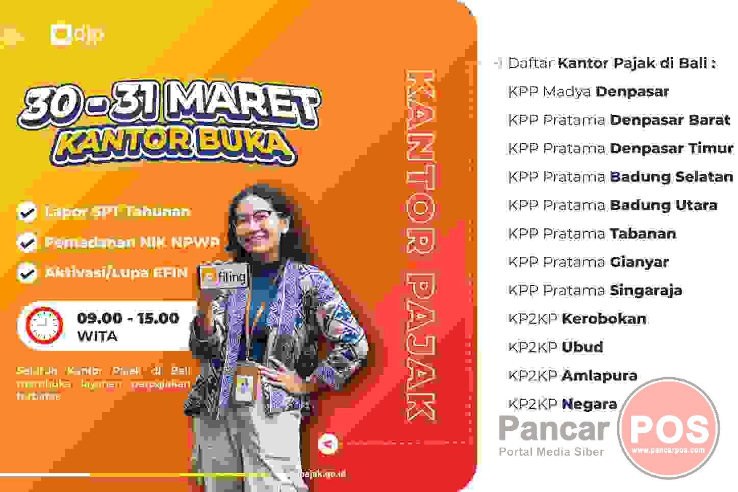 Denpasar, PancarPOS | Seluruh Kantor Pajak baik Kantor Pelayanan Pajak Madya (KPP Madya), Kantor Pelayanan Pajak Pratama (KPP Pratama) dan Kantor Pelayanan, Penyuluhan dan Konsultasi Perpajakan (KP2KP) di Provinsi Bali akan membuka layanan perpajakan bagi masyarakat yang difokuskan untuk melayani penyampaian SPT Tahunan Orang Pribadi pada hari Sabtu dan Minggu tanggal 30 dan 31 Maret 2024.