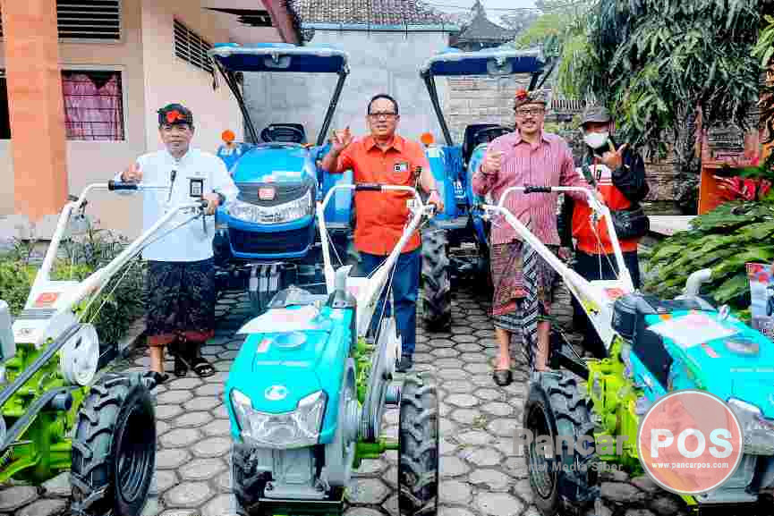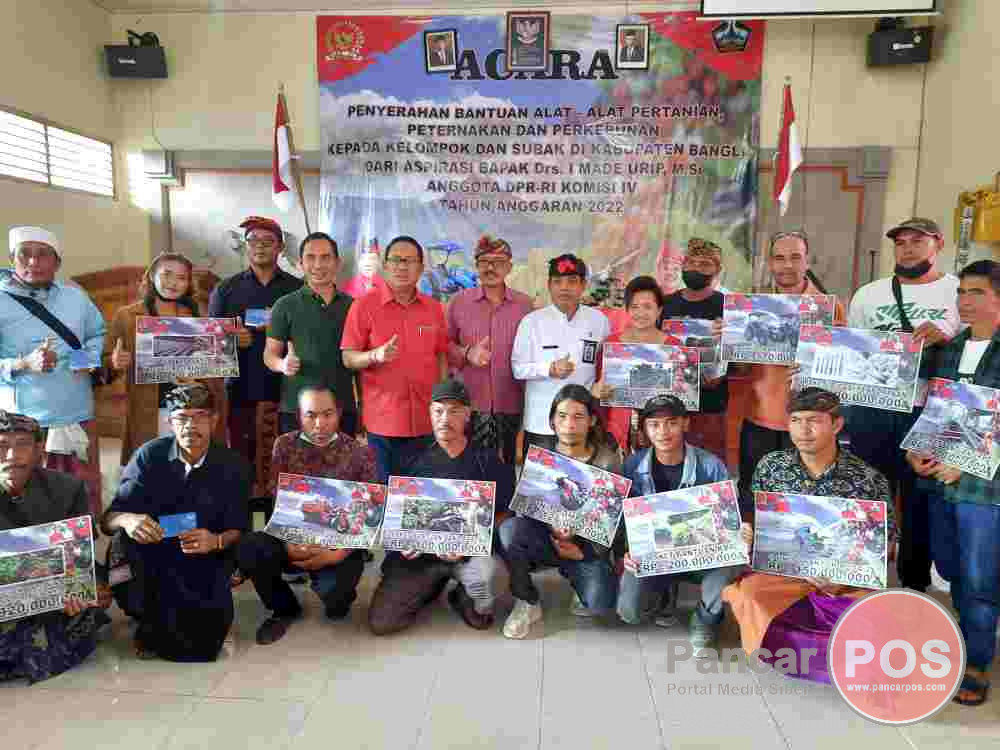 Bangli, PancarPOS | Anggota Komisi DPR RI dari Fraksi PDI Perjuangan, Drs. I Made Urip, M.Si., kembali mengucurkan bantuan aspirasi pertanian di Kabupaten Bangli Tahun 2022 senilai total Rp3,301 miliar. Bantuan diserahkan secara simbolis oleh Wakil Rakyat Sejuta Traktor yang akrab disapa M-U ini, bersama Wakil Bupati Bangli, I Wayan Diar, S.ST. Par., di Kantor Dinas Pertanian, Ketahanan Pangan dan Perikanan Bangli, Jumat (26/8/2022). Penyerahan bantuan Alsintan, atau alat dan mesin pertanian, peternakan dan perkebunan kepada kelompok dan subak di Kabupaten Bangli tersebut, senilai total Rp3,301 miliar, berupa 11 paket bantuan intensifikasi kopi dan peremajaan kopi Rp920 juta, 6 unit traktor roda dua Rp150 juta, 2 unit traktor roda empat Rp570 juta, 2 paket UPPO Rp400 juta, 4 paket irigasi perpompaan Rp400 juta, 4 paket P2L Rp200 juta, 2 paket KBR Rp200 juta, 15 ekor bibit sapi Rp150 juta, 2 paket Bang Pesona Rp100 juta, 9 unit pompa air Rp126 juta, 2 paket bantuan intensifikasi bawang merah Rp50 juta, dan 1 unit motor roda tiga Rp35 juta. Selain itu juga diserahkan 4 unit irigisi perpompaan menengah, bantuan embung, dan bantuan irigasi tersier.
