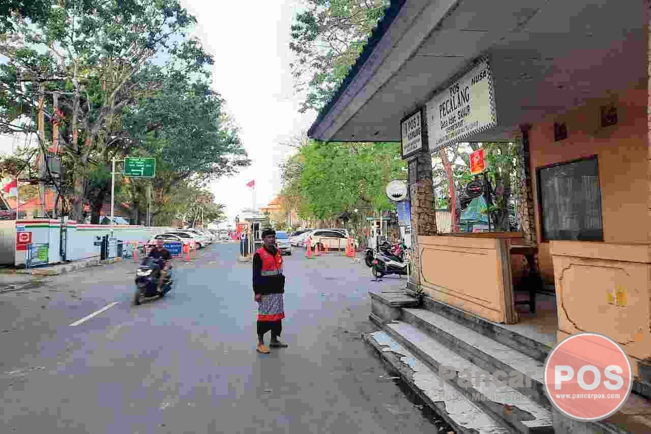 Pos Pecalang Desa Adat Sanur yang terletak di badan jalan masuk Pantai Matahari Terbit, Sanur, Denpasar. (foto: tra)