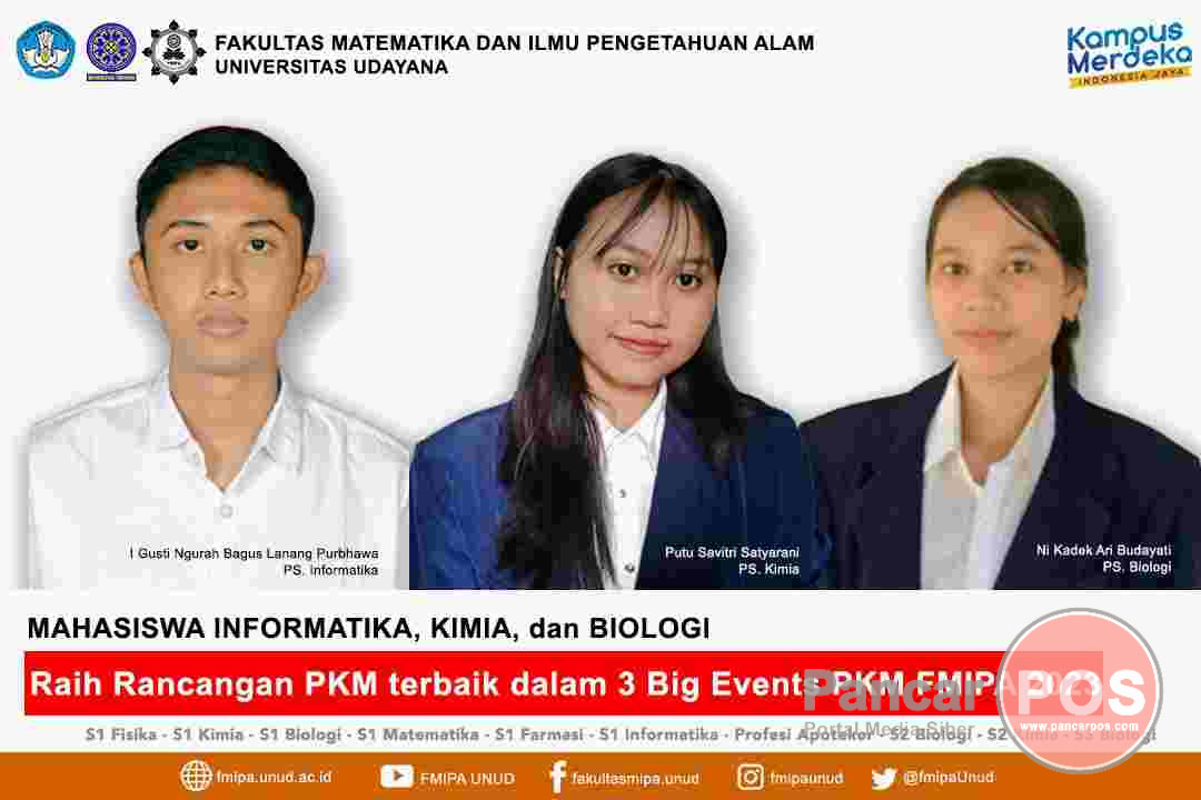 Badung, PancarPOS | Tiga Big Events PKM FMIPA 2023 merupakan program kerja Badan Eksekutif Mahasiswa (BEM) FMIPA Bidang Pendidikan dan Penalaran untuk menaungi PKM di lingkungan Fakultas MIPA Universitas Udayana. Tujuannya, untuk mengembangkan ide kreatif dan inovatif mahasiswa di lingkungan FMIPA agar dapat dituangkan ke dalam PKM sehingga menciptakan mahasiswa FMIPA yang kreatif, inovatif, dan berdaya saing tinggi. 3 Big event ini terdiri atas 3 rangkaian kegiatan, yaitu Inisiasi PKM (Program Kreativitas Mahasiswa), PPP (Pelatihan Penulisan Proposal) PKM, dan PPL (Pelatihan Penulisan Laporan) PKM. Yang pelaksanaannya dilakukan secara berurutan.