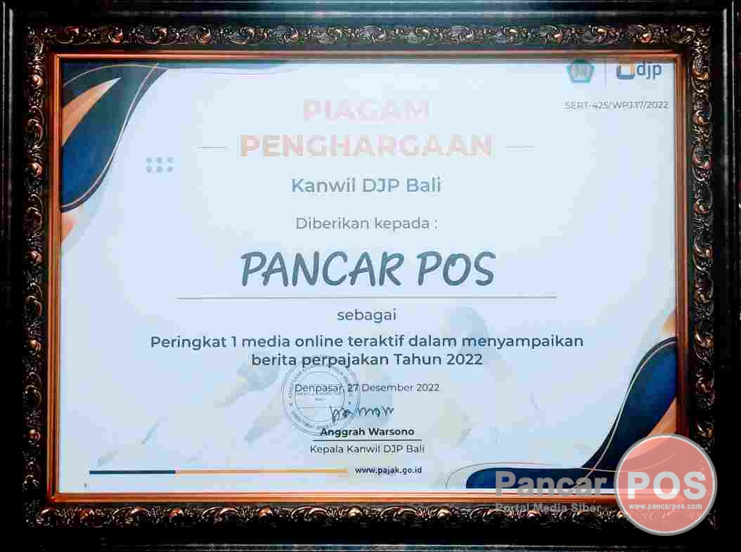 Denpasar, PancarPOS | PancarPOS.com sebagai merek portal media berita siber atau media online, makin bertabur prestasi dan penghargaan, baik lokal maupun nasional di Shio Macan Air tahun 2022. Kali ini, Media Pancar Group yang terdaftar dan terverifikasi Dewan Pers pada Anggara Umanis, Wuku Wariga, Selasa (10/5/2022), dengan Sertifikat No.994/DP-Verifikasi/K/V/2022 itu, dinobatkan sebagai Peringkat 1 “Media Online Teraktif” menyampaikan berita perpajakan di tahun 2022 oleh Kanwil Direktorat Jenderal Pajak (Kanwil DJP) Provinsi Bali.