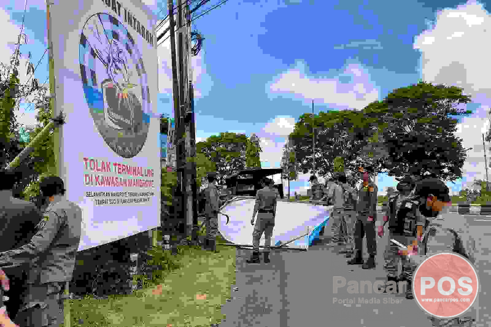 Denpasar, PancarPOS | Sejak lama baliho jumbo tolak proyek LNG liar dan tak berijin yang dibiarkan mengotori wajah Kota Denpasar menjadi pertanyaan banyak pihak. Namun, guna mentertibkan, sekaligus mengembalikan kenyamanan dan keamanan pada saat KTT G20 di Nusa Dua, Badung, operasi gabungan Satpol PP Provinsi Bali dan Kota Denpasar langsung tancap gas mengambil langkah tegas dengan membarangus semua baliho terutama yang dilintasi oleh para delegasi. Bahkan upaya tindakan tegas pun tidak ada istilah kata tebang, hal ini dibuktilan dengan diberangusnya juga baliho bertuliskan Tolak LNG.